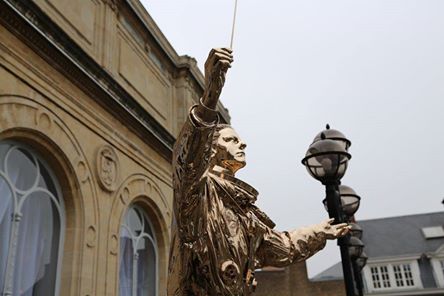 Jan Fabre, un artiste belge décidément en vogue, d’autant que, depuis peu, l’on retrouve, à Namur, différentes de ses créations. Ainsi sur la terrasse d’un lieu qui fut, après rénovations, il y a quelques années, ré-inauguré par la Reine Paola, le « Théâtre Royal », nous découvrons « L’Homme qui dirige les Etoiles » (cfr. ci-dessous), où Jan Fabre (°Antwerpen, 1958) sera à l’affiche en mai 2015, avec « Préparation Mortis » et « Le Pouvoir des Folies théâtrales ». Et dès le 14 mars, tout Namur vivra à l’heure de ce grand artiste anversois, avec l’événement « Facing Time: Rops / Fabre », dans le cadre de « Mons 2015 », nous offrant des expositions, au « Musée Félicien Rops » et à la « Maison de la Culture », ainsi que des oeuvres exposées sur le site de la Citadelle et dans les rues de la capitale wallonne. dont « L’Homme qui mesure les Nuages » (1998) et « Searching for Utopia » (2003).