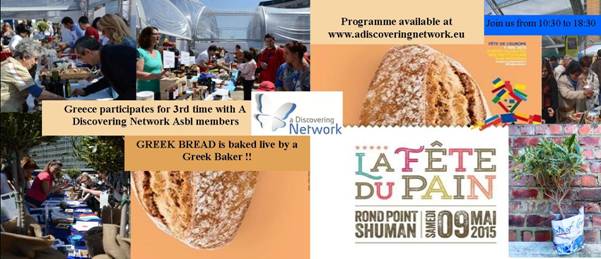 A Discovering Network (ADN) asbl participera aussi cette année à la Fête de l’Europe et La Fête du Pain au rond-point Schuman (Bruxelles) ce samedi 9/5 des 10h30 a 18h30 . Les visiteurs auront la chance de rencontrer les commerçants Grecs directement, découvrir leurs produits de haute qualité, déguster des spécialités grecques faits maison, boire le Frappe, découvrir ce qu’est l’hospitalité grecque.Mais la grande surprise est le boulanger qui vient de Grèce/Kozani et va préparer devant vos yeux du pain traditionnel. C’est une première.En plus, si vous voulez rentrer à la maison avec un petit olivier expédié directement de Grèce ou un tablier, vous soutiendrez nos activités volontaires ainsi que vous trouverez un cadeau différent pour la fête des mères. Merci de partager cette information. Le programme: www.adiscoveringnetwork.eu