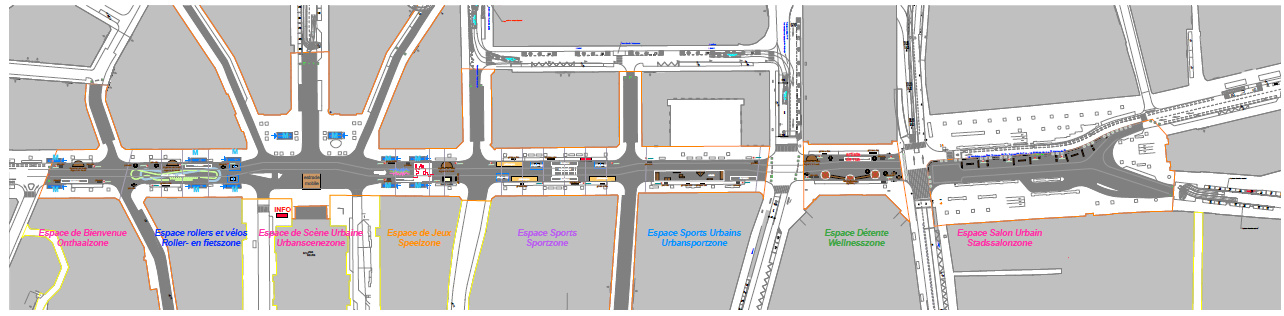 En outre, pour mener à bien l’aménagement temporaire, à partir du 28 juin huit espaces seront divisés selon différentes thématiques: 1.L’espace de Bienvenue; 2.L’espace rollers et vélos; 3.L’espace Scène Urbaine; 4. L’Espace de Jeux; 5.L’espace Sports; 6.L’espace Sports Urbains; 7.L’espace Détente et 8.L’espace Salon Urbain.