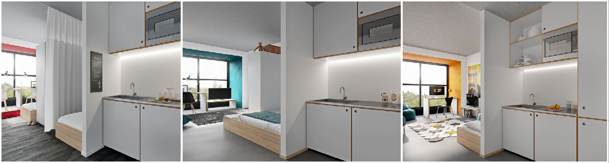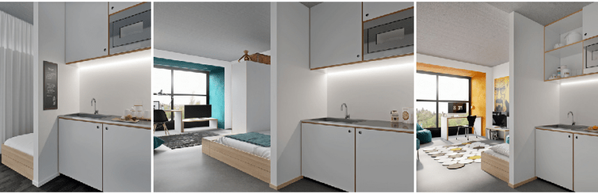 Les chambres sont de différents types: simple, partagé, des studios avec terrasses qui sont parfaits pour les couples et aussi à la fin de chaque étage il y aura des chambres pour personnes à mobilité réduite. Chaque chambre dispose d’une salle de bains et d’une cuisine privée, mais en même temps dans chaque étage il y a une cuisine commune avec une terrasse pour permettre de créer un espace où les étudiants peuvent se sentir accompagnés dans leurs repas et leur temps libre.