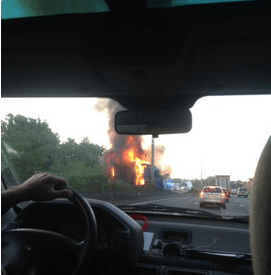 Un camion a pris feu car son réservoir a explosé. On parle d’une fourgonnette impliquée. Du diesel s’est répnadu sur la chaussée et les pompiers doivent tout nettoyer, ce qui prend beaucoup de temps.