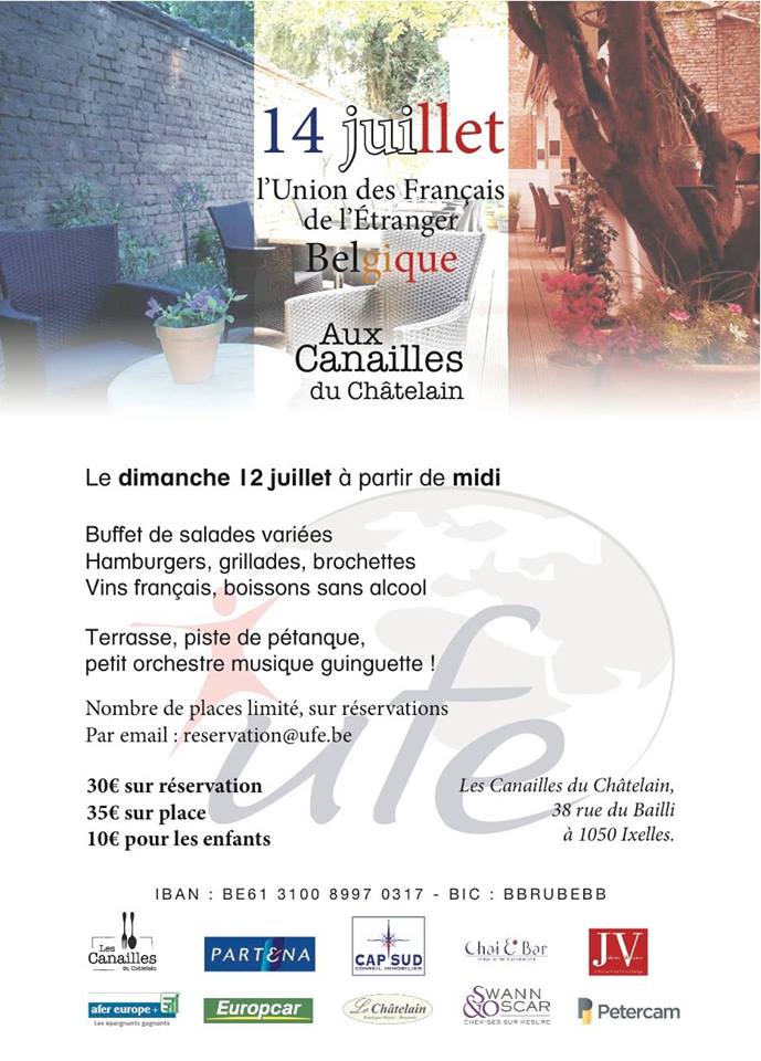 Rendez-vous est pris aux Canailles du Châtelain pour les français et leurs amis qui se sentent francophiles le dimanche 12 juillet aux Canailles du Châtelain, rue du Bailli 38 à 1050 Ixelles, dès midi.