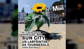 Jusqu’au 25 juillet, « Mons 2015 » nous attend sur la Grand’ Place de Mons, avec 7.500 tournesols, installés sur 5.000 palettes en bois, dans un espace de 3.000 m2 (100m sur 30m), une installation due à l’artiste française Fanny Bouyagui – et à « Conception Art Point M », qui a réalisé le montage de ce labyrinthe floral -, son projet ayant demandé 2 ans de préparation, Yves Vasseur, le commissaire général de la « Fondation », lui ayant simplement demandé d’imaginer une animation estivale devant l’Hôtel de Ville.