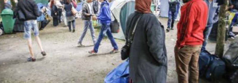Een aaneenkoppeling van hutten, tenten, fraaie beschermingen voor de migranten die op hun inschrijving wachten op de dienst vreemdelingen.