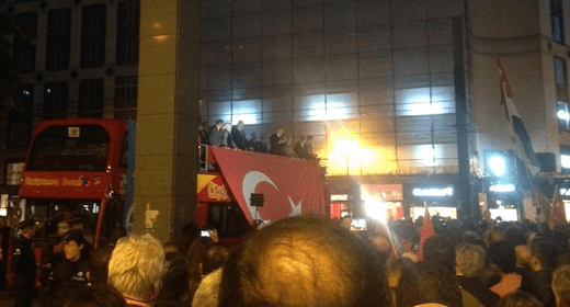 Erdogan, le président turc, arrivé ce dimanche midi à Bruxelles avec son épouse voilée et en Belgique pour plusieurs jours en a profité pour mener un meeting de campagne improvisé de l’AKP sur le toit d’un bus, auprès de l’hôtel Steigenberger où il séjourne pour vanter sa politique nationaliste et islamoconservatrice turque à quelques jours des élections présidentielles turques.