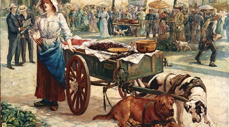charrette du boucher, de la laitière ou du boulanger, et qui témoignent, par leurs aboiements triomphants, du plaisir orgueilleux qu’ils éprouvent à rivaliser avec les chevaux ? », demandait Baudelaire, ce qui est fort bien illustré par une toile de Van Ginst, « La Marchande de Cerises ».