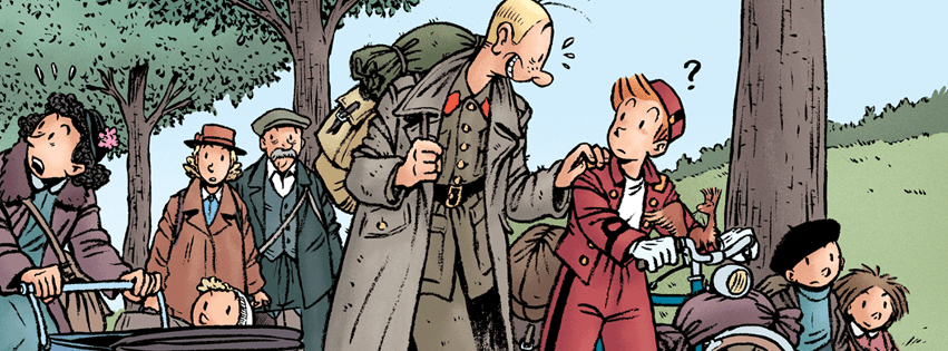 Synopsis : « Nous sommes à Bruxelles, en 1940. Des enfants se lancent des boules de neige. Parmi eux, « Spirou », quelque peu rajeuni. Un policier est blessé et « Spirou » est emmené au commissariat de police. Rapidement libéré, il reprend ses fonctions de groom au « Moustic Hôtel ». « Fantasio » vient à sa rencontre. Ensemble, il vont boire un café au domicile d’un couple de peintres juifs. A l’aube d’un matin de mai, des avions allemands survolent la capitale… »