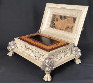 Curiosités, aussi, que ces boîtes de cigares cubains acquises par la « Galerie Yannick David » (B-27), ce dernier, antiquaire depuis 1981, ayant rencontréen 1996, un guide local amateur d’art durant un voyage à Cuba établit un contact suivi avec ce dernier, lui permettant d’acheter de nombreuses nouvelles pièces, dont deux, exposées et proposées à la vente, sont particulièrement intéressantes, l’une d’elles ayant appartenu au Président Mario Garcia Geocal et la seconde, datant de 1870, à l’époque de la colonisation espagnole, fut confectionnée par la firme « Hupman », à l’occasion de son 40ème anniversaire, cette dernière étant réalisée en argent et en bois précieux, avec, sur le couvercle, la mention incrustée « Havana 1854-1894 », des cabochons en argent et têtes d’angelots la décorant.