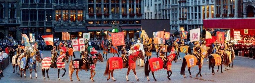 Historiquement, il s’agit d’une procession en l’honneur de Notre-Dame du Sablon, organisée par le « Grand Serment des Arbalétriers ». Rapidement, les différents corps constitués de la Ville vont s’y joindre, afin de transformer l’événement en un cortège prioritairement mondain.A noter que ce terme d’ « Ommegang », en latin « circumamabulatid », signifie « marcher autour », en néerlandais, ce que ses 1.400 participants (dont 180 représentants de la noblesse belge) font à leur arrivée sur la Grand’ Place., cette reconstitution bruxelloise se déroulant, annuellement, depuis 1930.