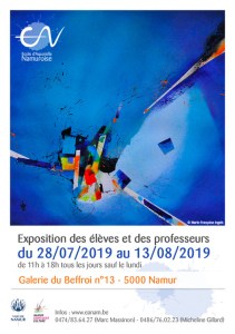 Jusqu’au 13 août, à la « Galerie du Beffroi », en partenariat avec la Ville de Namur, l’ « ENAM » (« Ecole d’Aquarelle Namuroise ») présente près de 200 travaux réalisés, par ses stagiaires et ses professeurs, durant l’année scolaire 2018-2019.