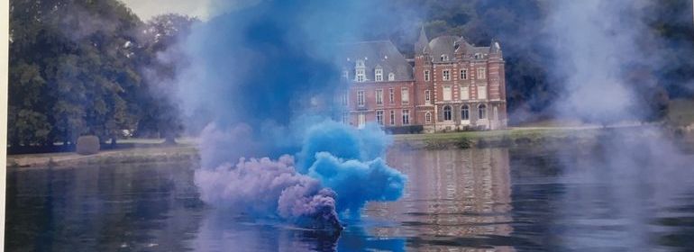 Pour « Confluent », Mathilde Guillaume écrit : « A chaque endroit, Filippo et Dominique on été chaleureusement accueillis, et ont vécu des moments uniques. Aux lacs de l’Eau d’Heure, le vent était fort et les fumigènes erent du mal à prendre, mais l’explosion finale de couleurs était fantastique. Cette photo fut si bien réusse qu’elle est devenue l’affiche de l’exposition ! »
