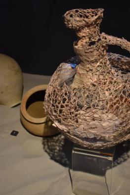 Posé sur la vitrine du meuble voisin, une oeuvre étonante de Cécile Ahn attire notre attention, la reproduction d’une poterie antique, … en papier de récupération tricoté. Concernant son long travail créatif, fort de gestes répétitifs, elle écrit : « J’utilise des papiers de récupération : des journaux, des magazines, … Ce matériau de base que tout le monde a chez soi, je le transforme patiemment en fil. J’obtiens des pelotes que je tricote par la suite avec des points de base… »