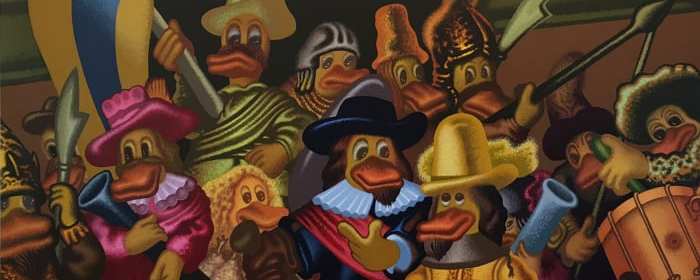 … Et que dire de sa réappropriation de « La Ronde de Nuit » de Rembrandt (Rembrandt Harmenszoon van Rijn/1606-1669), sous le titre « Nightwatch II », une acrylique sur toile (198,1 x 233,7 cm) peinte en 2016. ou de son portrait réaliste de Vincent Van Gogh (1853-1890), se coupant son oreille gauche, disant, dans une bulle propre aux « comics » :« la prochaine fois, écoutez attentivement »…