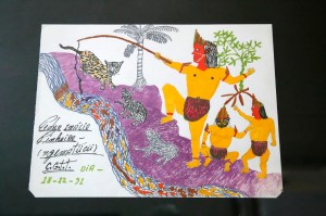 En page 77 du livre-catalogue nous apprenons comment naquit le peuple Ticuna, selon le récit, fidèlement retranscrit, que fit, en 1984, Pedro Inàcio Pinheiro Ngematücü :« Il y a longtemps qu’il n’y avait que des nuages et de l’eau, une obscurité totale – et dans cette onbscurité se trouvait le Créateur, Ngutapa. Ngutapa se sentait seul et fit donc apparaître une boule de terre sur l’eau afin de revivre… »