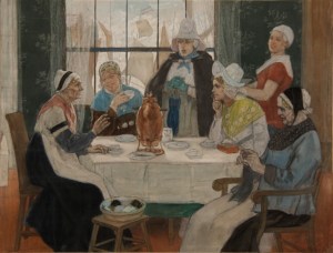 A propos de cette dernière oeuvre, parmi les 183 lettres rédigées par Félicien Rops, à l’attention de « Mars », notons celle-ci, rédigée le 1er janvier 1878 : « …le sujet est : quatre vieilles hollandaises prenant le thé dans une maison bourgeoise & parlant d’un scandale – costume hollandais de ces petites bourgeoises de la Nord-Holllande dans laquelle j’ai tant rodaillé.C’est en couleur, sur papier Pelée, cela donne des tons spéciaux fort doux & des travaux intéressants. Je compte faire beaucoup de ces ‘Pelées’ dans la collection. »