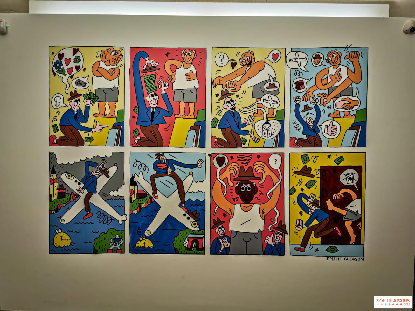 L’exposition parisienne est découpée en deux parties, le parcours débutant par des BD dont il était friand, tel « Pim Pam Poum », de Rudolph Dirks (1877-1968), qui sont à l’origine de son envie de réaliser, lui aussi, des bandes dessinées.