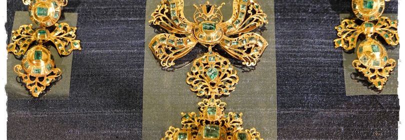 De la religion passons aux luxueuses parures des dames de la noblesse, alliant l’émeraudeà l’or, comme nous le démontre une demi-parure espagnole du XVIIIè siècle, propriété du « Musée du Louvre », en dépôt au Château de Compiègne, le port de cette demi-parure étant illustré par un tableau deLouis-Michel Van Loo (1707-1771) d’Elisabeth Farnèse (1692-1766), Reine d’Espagne de 1714 à 1746. Ce noeud de corsage, enor, en forme de « noeud à la Sévigné », comprend une grosse émeraude centrale et de petites émeraudes.
