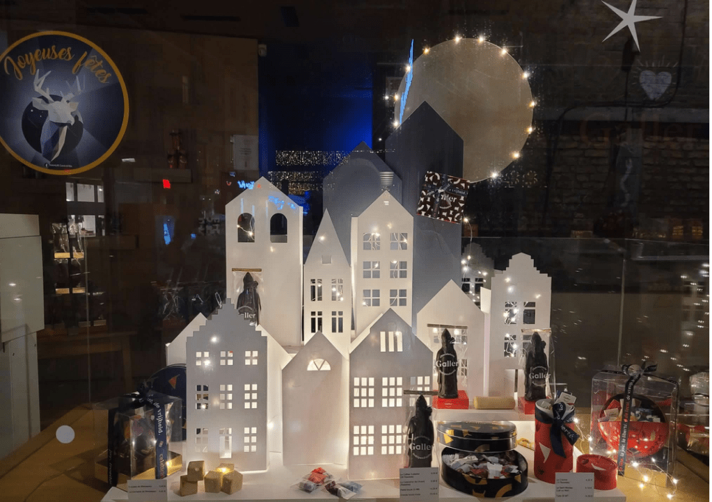 Notons que l’ambiance de Noël se retrouve dans plusieurs vitrines de commerces, des vendeurs ambulants proposant leurs articles lumineux.