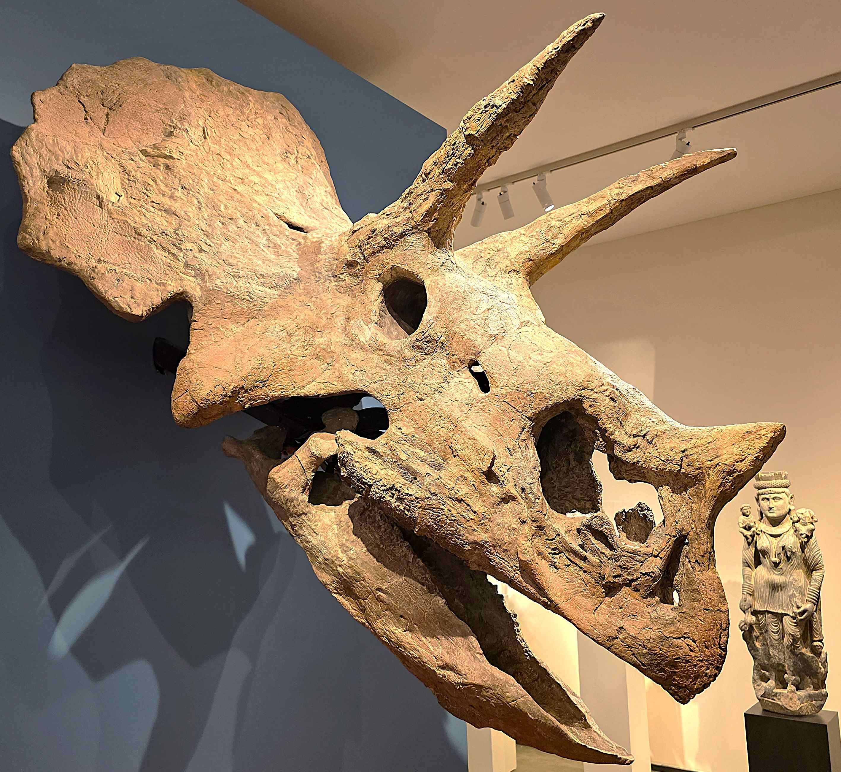 *** « Grusenmeyer-Woliner » (Bruxelles/stand 138), nous présente, notamment, le « Crâne d’un jeune Tricératops » (« Baby Jane »), vieux de 66-68 millions d’années, appartenant à la toute dernière génération de dinosaures, avant leur extinction. découvert, en 1998, dans la célèbre formation de Hell Creek, sise dans le Dakota du Sud, ainsi qu’une sculpture en schiste gris, d’une hauteur de 125 cm, provenant de l’ancienne région du Gandhara (Nord-Ouest du Pakistan), « Hariti, Protectrice bouddhiste des Enfants » (IIIe-IVe siècle), qui, à l’origine était une yakshi, qui dévorait les enfants, pour nourrir sa propre famille nombreuse, avant de se convertir au bouddhisme, devenant leur protectrice.