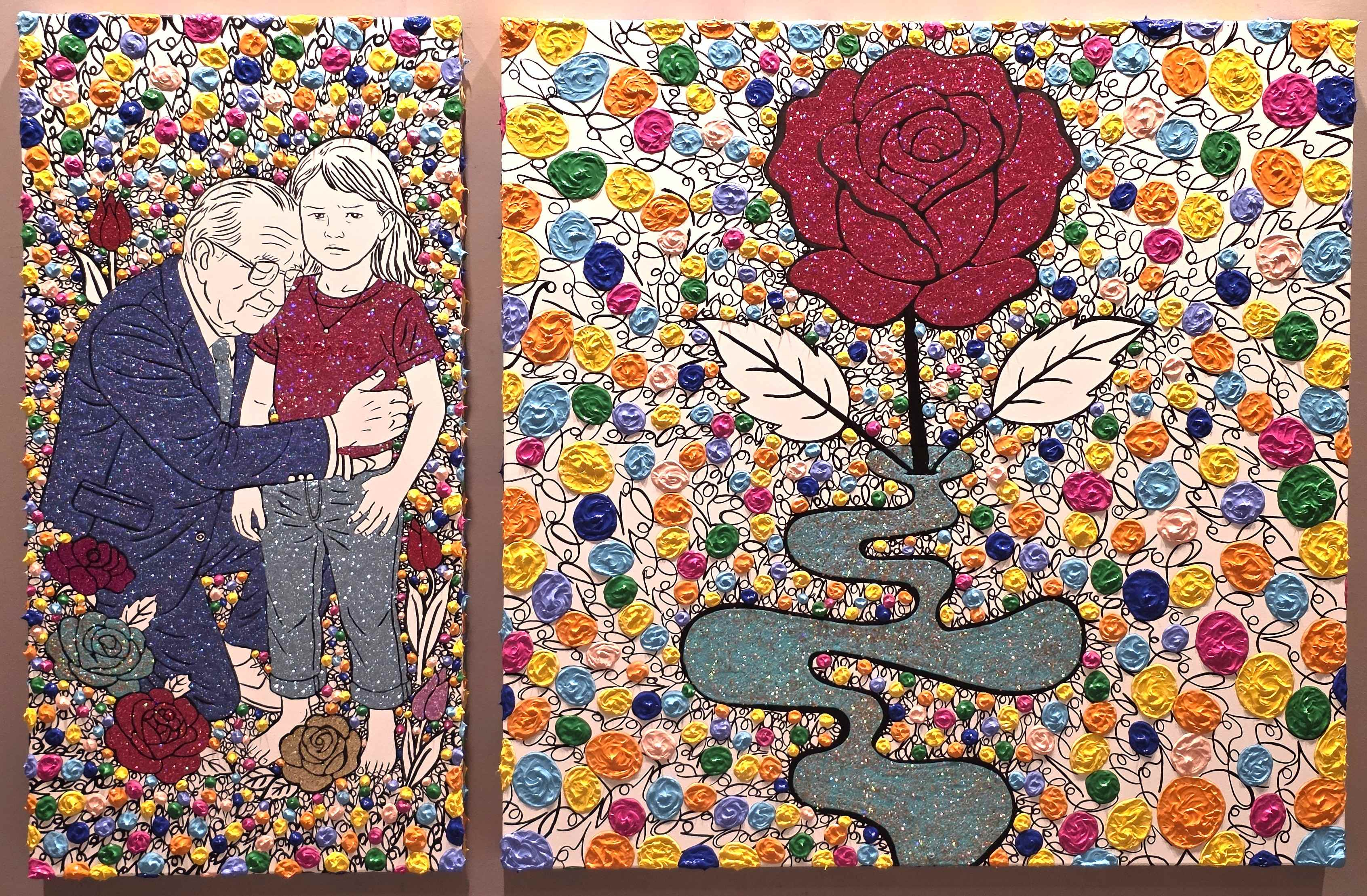 *** « Guy Pieters Gallery » (Knokke-Zoute/stand 108), qui – outre, entre autres, des oeuvres de Karel Appel (1921-2006), Arman (Armand Fernandez/1928-2005), César (César Baldaccini/1921-1998), Christo & Jeanne-Claude (Christo Vladimiroff Javacheff/1935-2020 & Jeanne-Claude Denat de Guillebon/1935-2009), Niki de Saint Phalle (Catherine de Saint-Phalle/1930-2002), Jan Fabre (°Antwerpen/1958) & Jean-Michel Folon (1934-2005) – nous présente « Love is the Higher Power », l’un des trois diptyques de la princesse Delphine de Saxe Gobourg (°Uccle/1968), où, pour la première fois, elle peint on père, le roi Albert II (°Laeken-Bruxelles/1934), la princesse-artiste ayant été accueillie à la « BRAFA », en compagnie de son mari, Jim O’Hare.