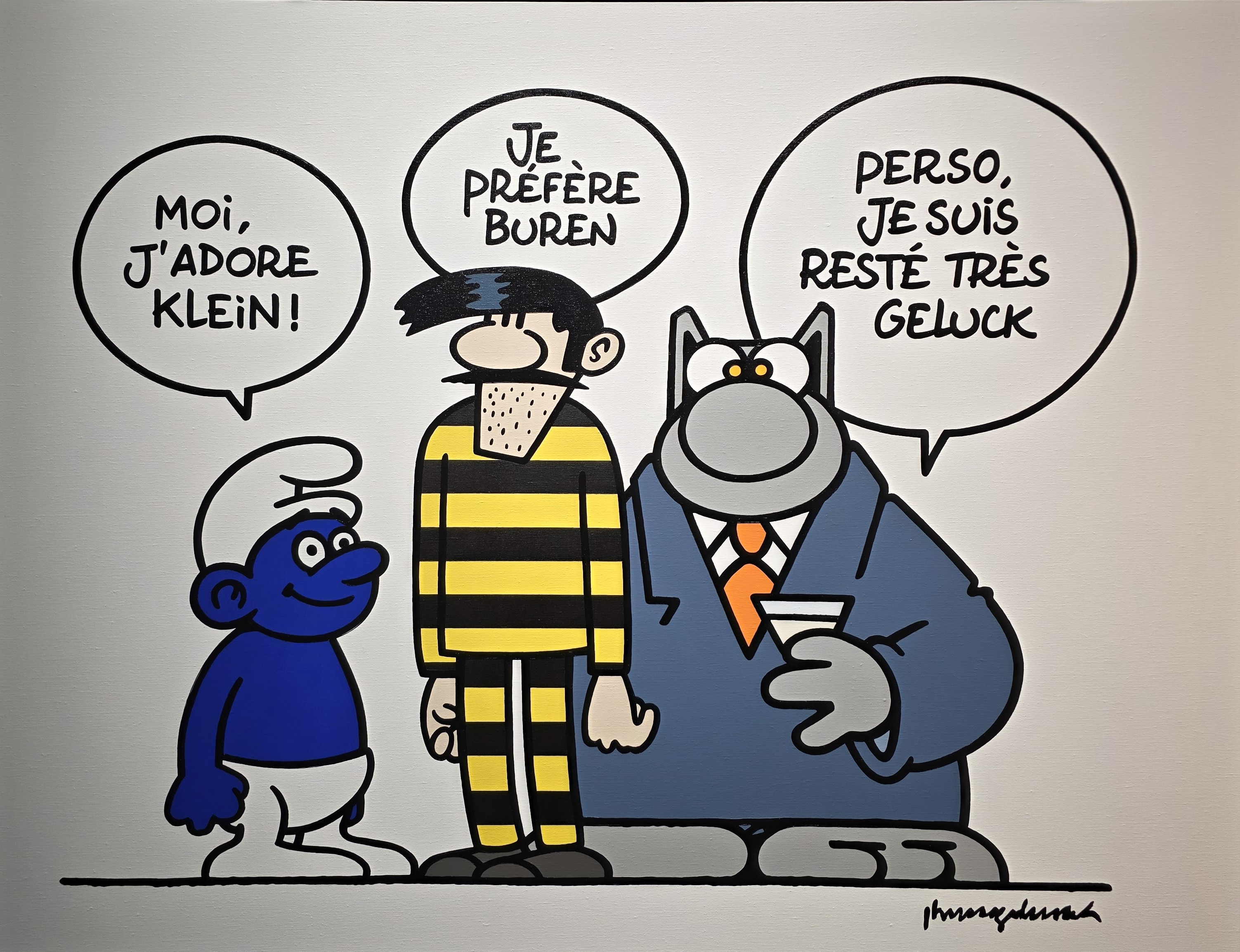*** « Galerie Huberty & Breyne » (Bruxelles &Paris/stand 84), fondée en , par Alain Huberty & Marc Breyne, également présente à Paris, depuis 2020, elle offre à la « BRAFA », depuis plusieurs années, une fort intéressante approche de la bande dessinée, Philippe Geluck (°Bruxelles/1954), le créateur du célèbre « Chat » étant présent sur le stand, ce vendredi 23 janvier. Outre nombre de ses peintures & sculptures, nous découvrons des créations contemporaines de François Avril (°Paris/1961), Dominique Corbasson (1958-2018), Nicolas de Crécy (°Lyon/1966), Jean-Claude Götting (°Paris/ 1963), Agnès Hostache (Milan Jespers (°Bruxelles/1992), Loustal (Jacques de Loustal/°Neuilly-sur-Seine/1956), François Roca (°Lyon/1971) & Fabio Viscogliosi (°Oullins/1965).