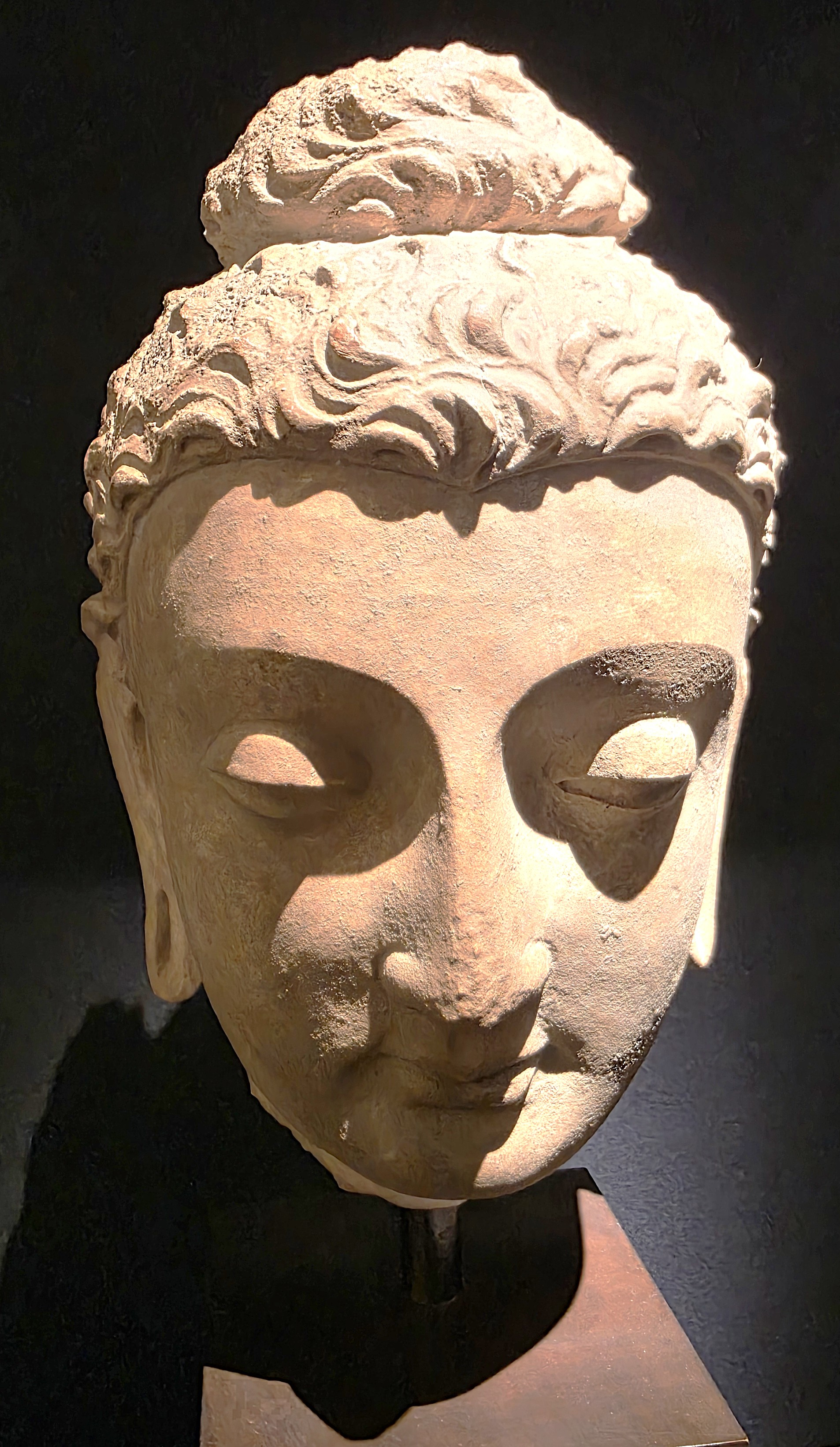 stuc et pigments naturels (IIIe siècle avant notre ère), provenant du Gandhāra, une oeuvre dévoilant la finesse de l’art gréco-bouddhique, où réalisme hellénistique et spiritualité orientale se rencontrent, l’expression sereine et contemplative du visage incarnant l’idéal bouddhiste de paix intérieure & d’équilibre.